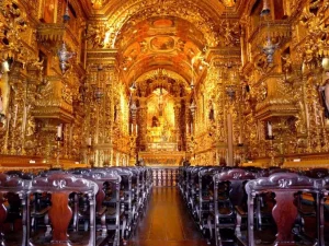 Um dos mais extraordinários monumentos do barroco mundial. Foi construída entre 1686 e 1750 e é a igreja mais rica do país: 800 quilos de ouro foram usados para dourar a talha de madeira. Os azulejos da igreja e do claustro trazem cenas da vida de São Francisco. Repare, num dos altares laterais, na belíssima imagem de São Pedro de Alcantara, obras de Manuel Inácio da Costa.